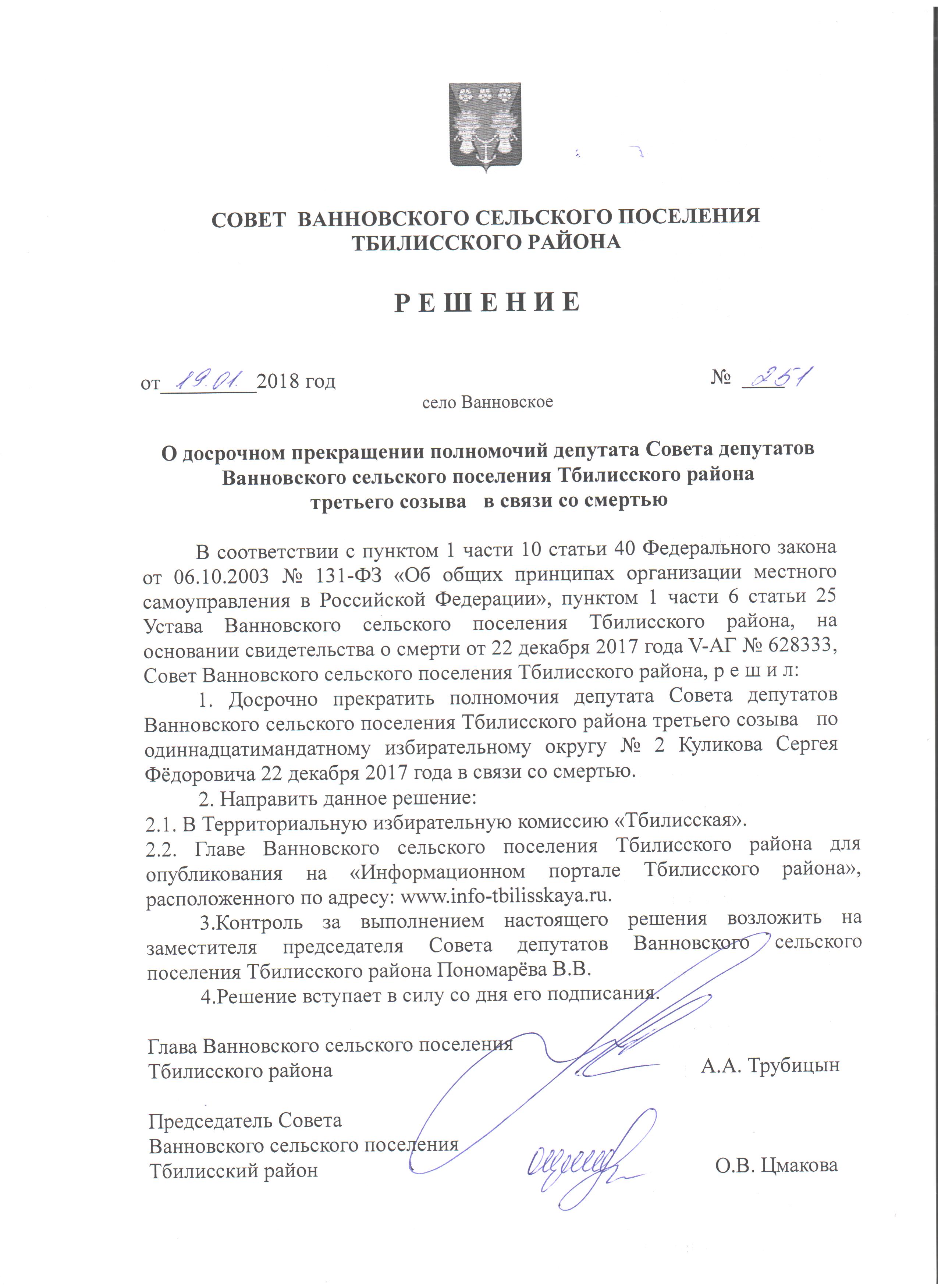 О досрочном прекращении полномочий депутата Совета депутатов Ванновского сельского поселения Тбилисского района третьего созыва в связи со смертью |