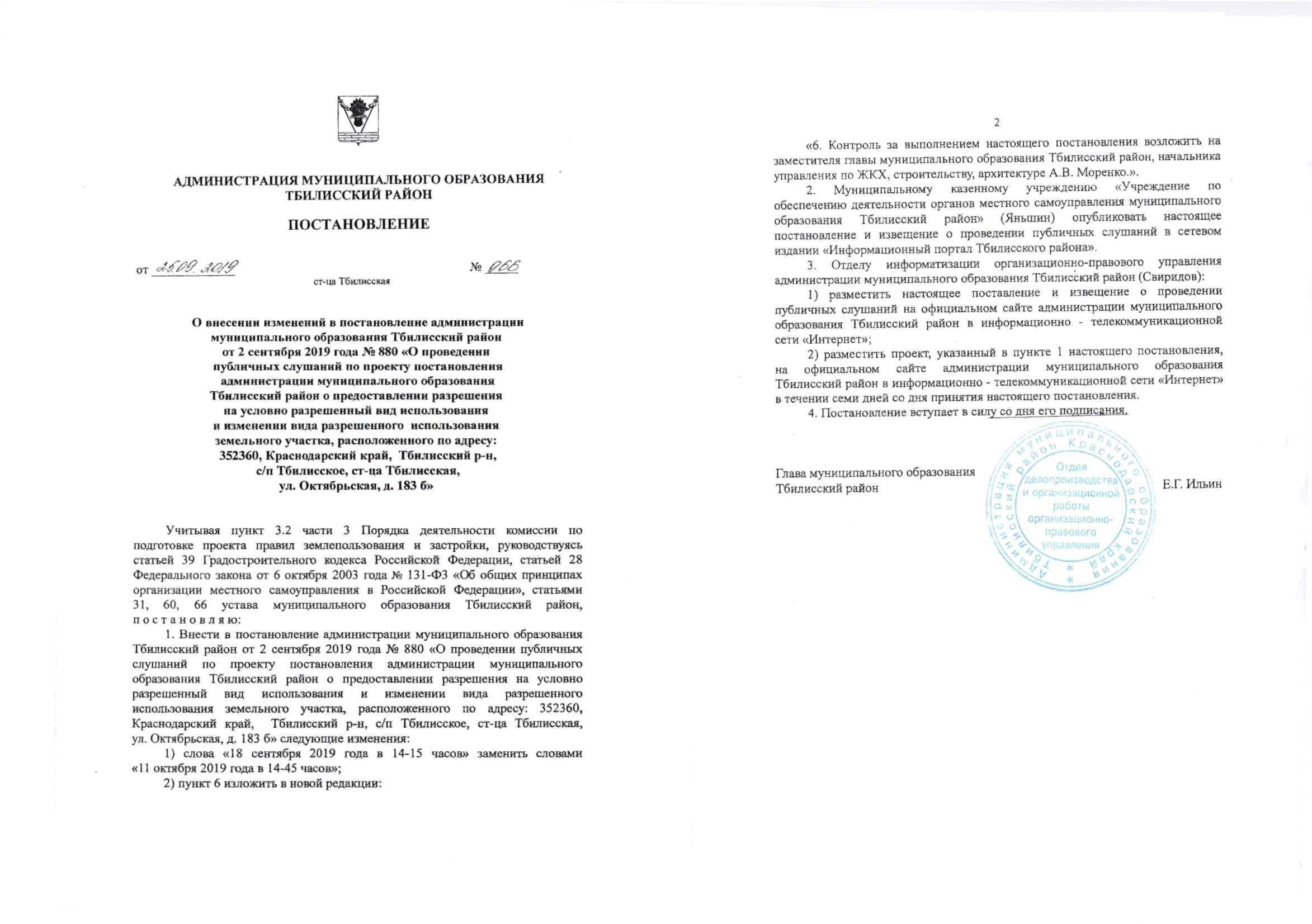 О внесении изменений в постановление администрации муниципального образования Тбилисский район от 02 сентября 2019 года № 880 "О проведении публичных слушаний по проекту постановления администрации муниципального образования Тбилисский район о предоставлении разрешения на условно разрешенный вид использования и изменении вида разрешенного использования земельного участка, расположенного по адресу: 352360, Краснодарский край, Тбилисский р-н, с/п Тбилисское, ст-ца Тбилисская, ул. Октябрьская, д.183 б"