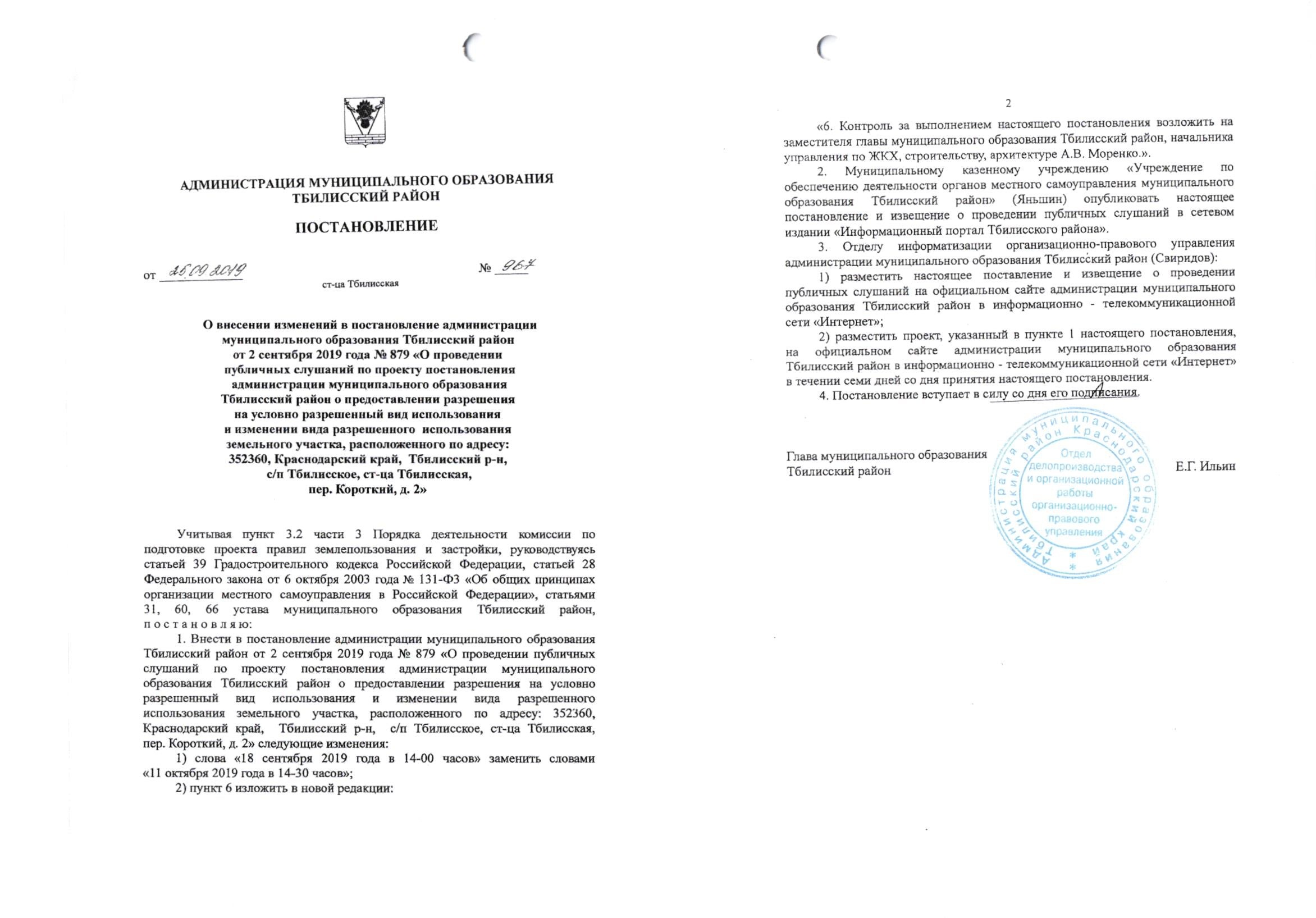 О внесении изменений в постановление администрации муниципального образования Тбилисский район от 02 сентября 2019 года № 879 "О проведении публичных слушаний по проекту постановления администрации муниципального образования Тбилисский район о предоставлении разрешения на условно разрешенный вид использования и изменении вида разрешенного использования земельного участка, расположенного по адресу: 352360, Краснодарский край, Тбилисский р-н, с/п Тбилисское, ст-ца Тбилисская, пер.Короткий, д.2"