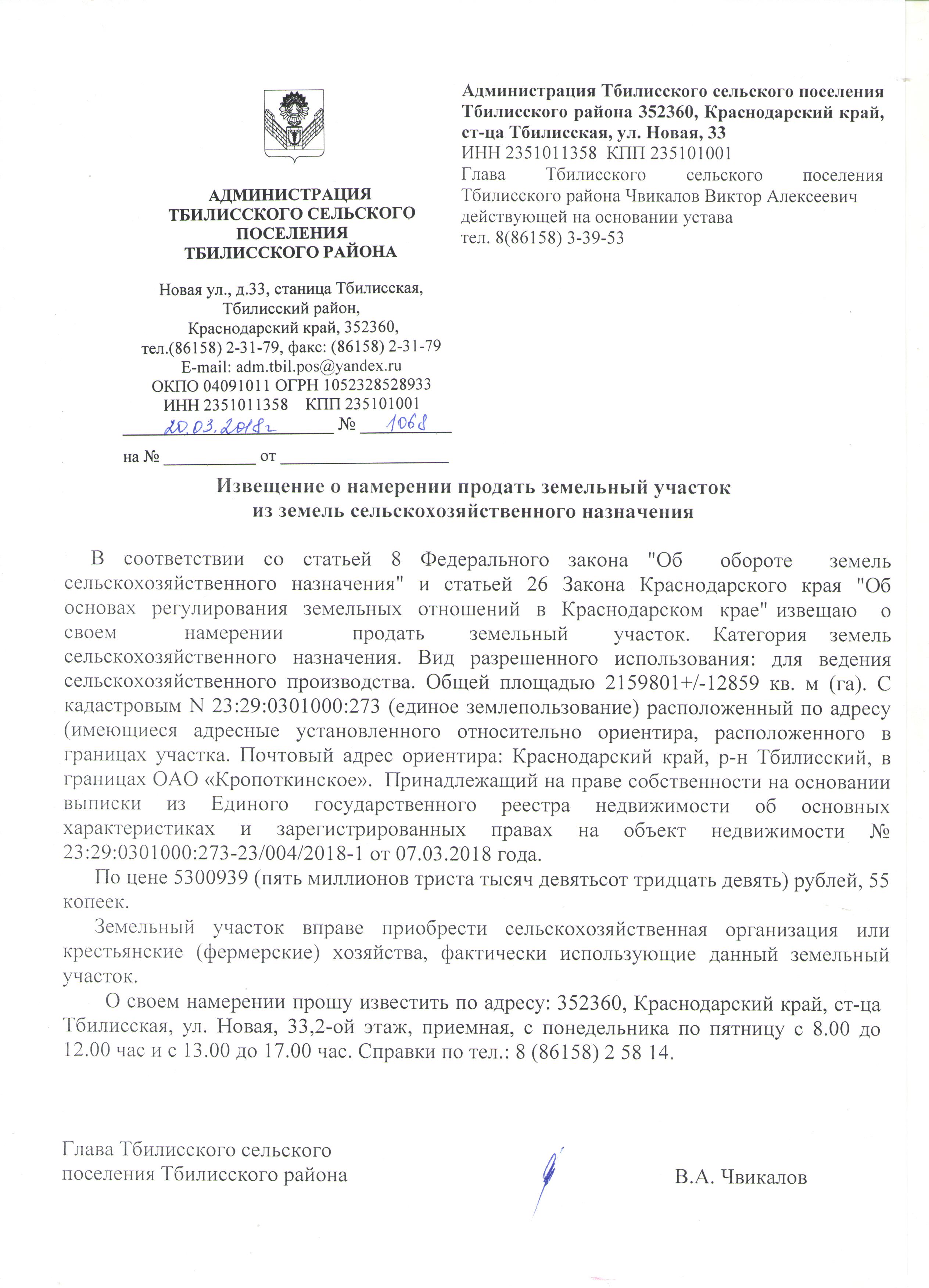 В соответствии со статьей 8 Федерального закона "Об обороте земель сельскохозяйственного назначения" и статьей 26 Закона Краснодарского края "Об основах регулирования земельных отношений в Краснодарском крае" извещаю о своем намерении продать земельный участок.