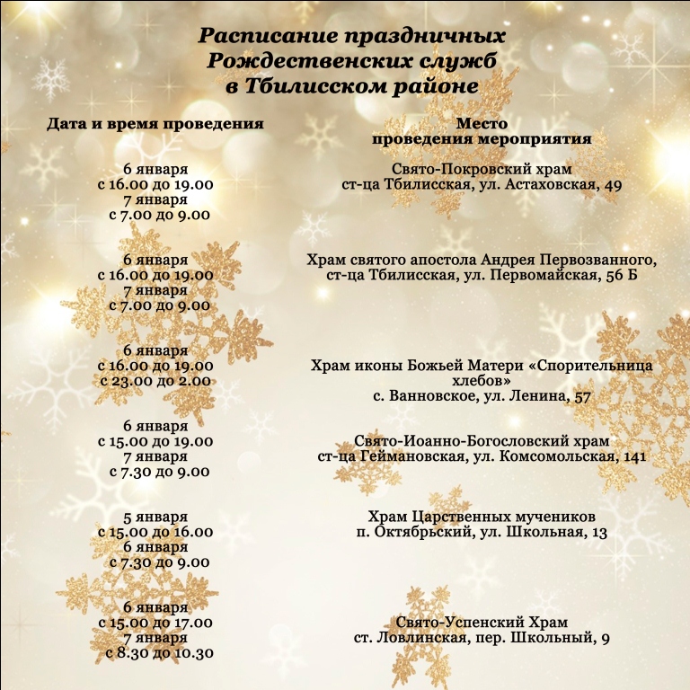 Приглашаем вас принять участие в новогодних мероприятиях. Ознакомиться с запланированными мероприятиями можно здесь: План мероприятий Расписание праздничных Рождественских служб в Тбилисском районе